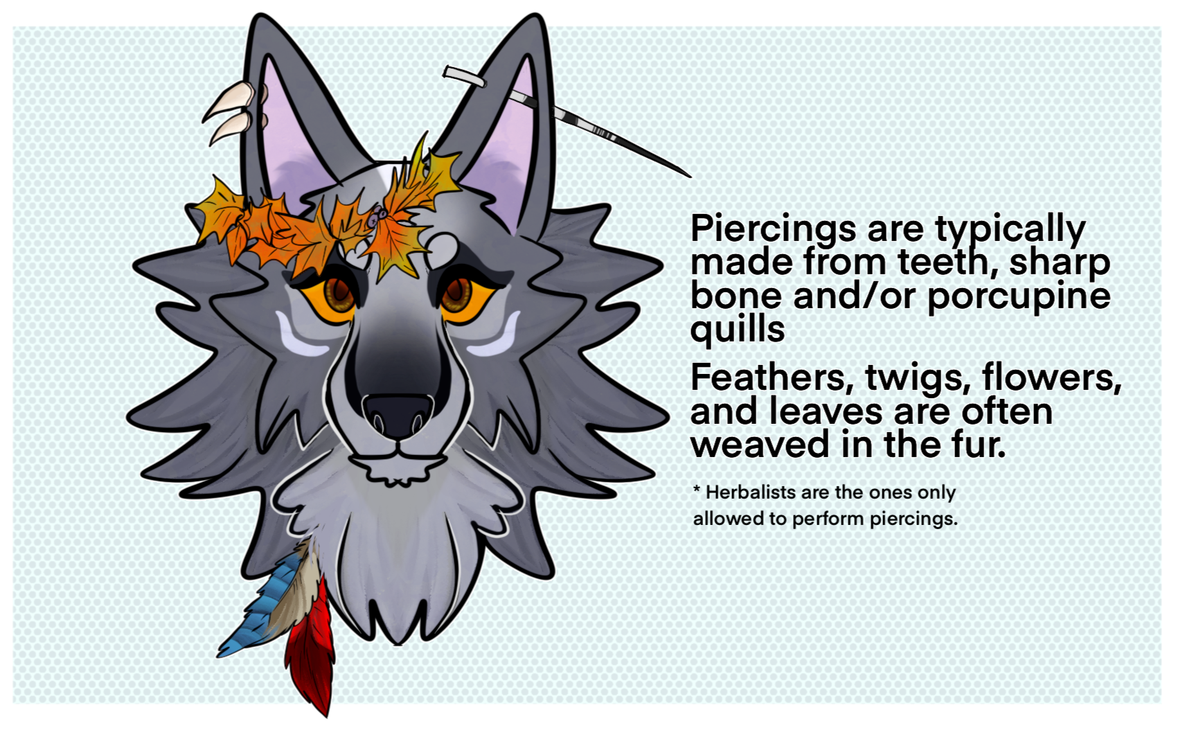 As for more 'complex' accessories like small bone ear piercings must be done by a herbalist of tier 4 to be able to perform the piercing.Characters may not wear things such as actual jewelry, armor, and clothing. Keep in mind that this roleplay does NOT condone usage of closed cultural items or clothes to be worn or considered (i.e a feather behind the ear, feather headdress', etc.).If your character is a dog, or descendant from once human-owned dogs many years ago, they may be wearing their collars they once had as a human pet. And are more than welcome to use this collars as an "heirloom" for their kin. Sadly, there are no radio collars due to the fact humans are still in the late 13th to early 14th Century.